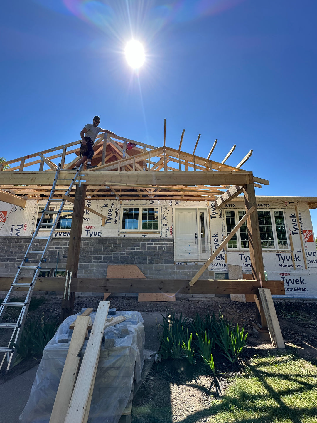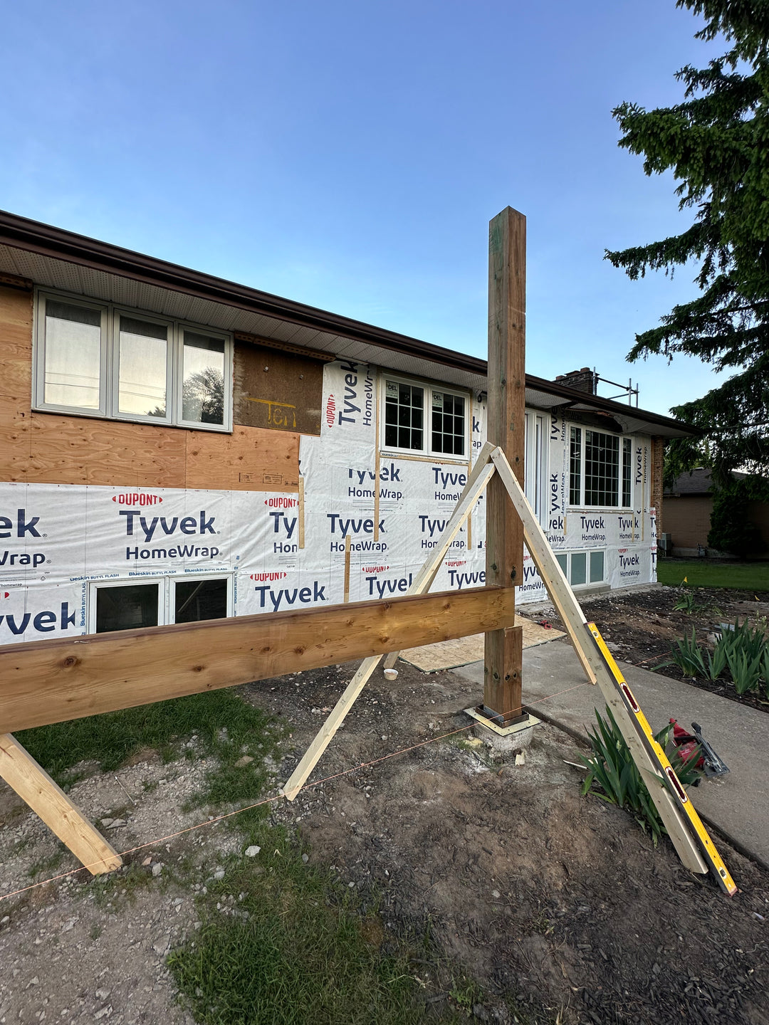 Having a spacious front porch was a dream that became reality once we removed the brick facade and relocated the front door to the main floor. We started by digging post holes for the porch footings, then set heavy posts and beams to support the new structure.
