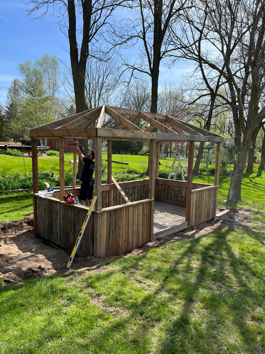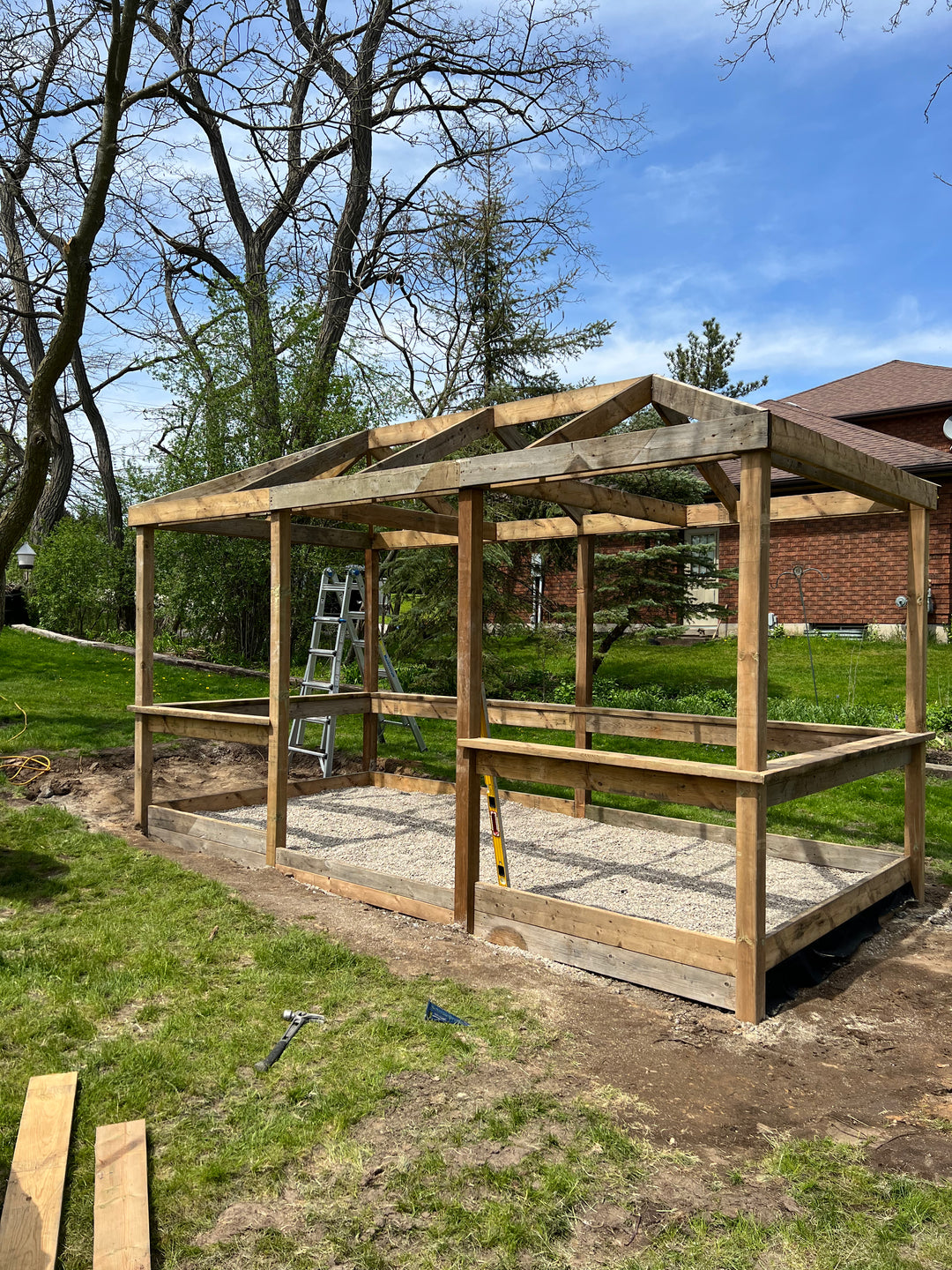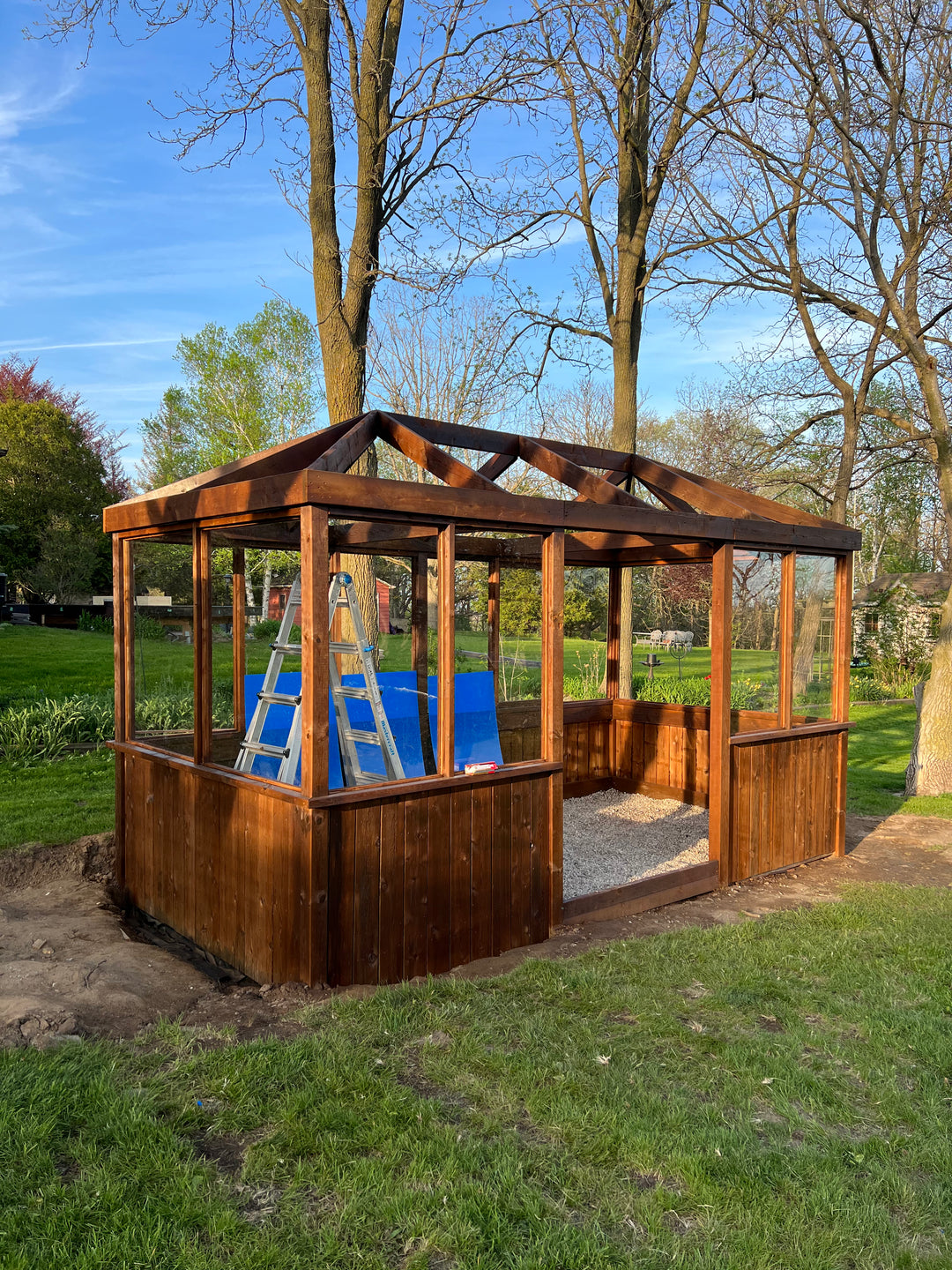 - What material did you use for the floor? Pea gravel! Same gravel that is in our vegetable garden and firepit.